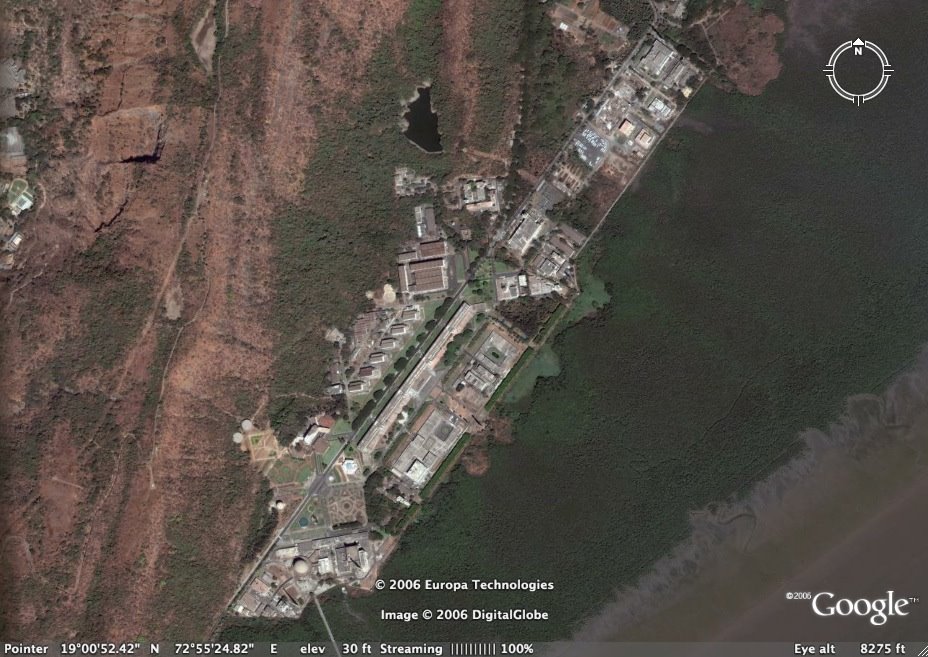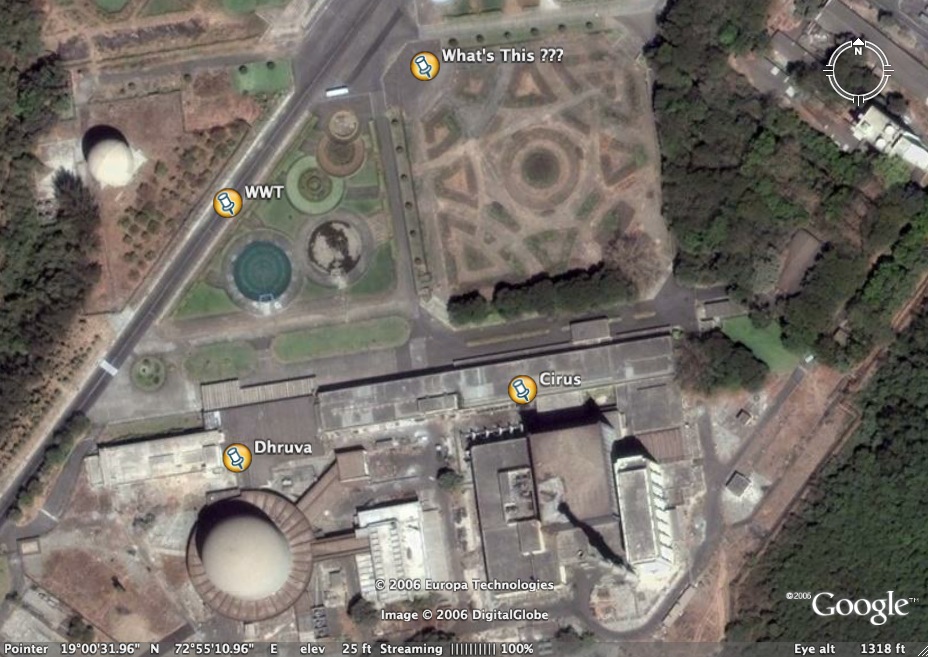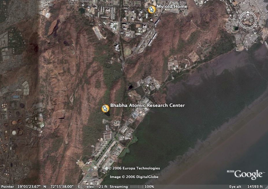 So here I was playing around in GoogleEarth (I am addicted to it BTW) and was flying over the Bhabha Atomic Research Center in Mumbai. This is the place where all the nuclear research brains of India hang out. (My Dad would of course dispute that fact as he worked for the Engineering Division – you know – the guys that actually build the big nuclear power reactors – while the scientists play around with the toy reactors). There’s probably a greater concentration of PhD’s in this 2 square mile complex than anywhere else on the planet. And of course there are a bunch of Nuclear Reactors. Here’s an aerial shot of the complex. Click on the images to open the full size images.